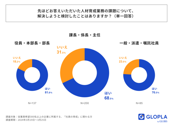 役職別で見ると「人事育成上の課題解決を検討したことがない」という回答が最も多い層は「課長・係長・主任」で31.5%に上った。