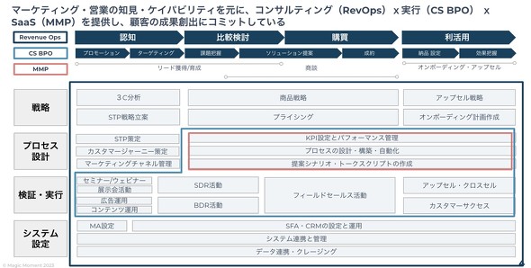 しかし、第3回のNTTデータ、NTTデータ・スマートソーシング、当社Magic Moment の3社共同の委託型のRevOpsのPoCについてご紹介したように、BPOやBPaaSといった委託サービスの組み合わせ次第では、内製化することなく、既存のリソースでRevOpsを実装できることをご説明しました。ここで解説したのは、多大なリソースが必要なRevOpsのプロセスを外部の人の手によってテクノロジーを活用しながら実装するという取り組みでした。