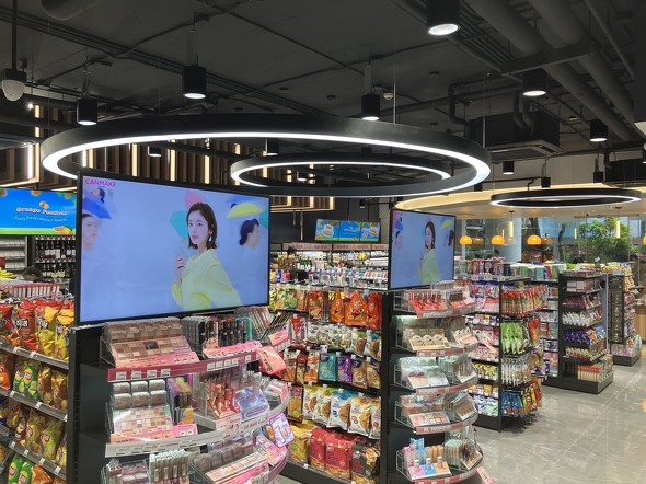 店内には「和×未来」をコンセプトにした内装デザインを採用し、日本の甘味処や茶屋をイメージしたインテリアを設置した。また、セルフレジと商品告知などを行うデジタルサイネージを導入。いずれもタイのローソン店舗では初の設置となる。レジや店内販促物の付け替えといった業務を削減し、店舗運営の効率化を図る狙いだ。