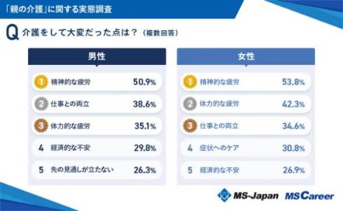 男女別で見ても「精神的な疲労」が最も多く票を集め、男性は50.9%、女性は53.8%で共に1位となった。また、男性は「先の見通しが立たない」(26.3%)が5位にランクイン。女性は「症状へのケア」(30.8%)が4位に入る結果となった。