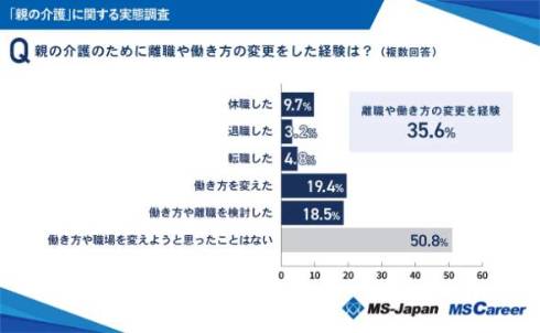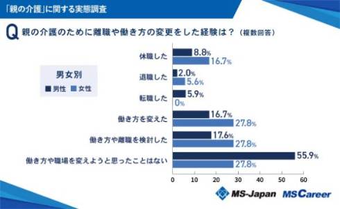 親の介護のために離職や働き方の変更をした経験がある人は35.6%と、4割近くに迫った。働き方を変えた人は19.4%、退職した人は3.2%、休職した人は9.7%だった。また、男女別で見ると、離職や働き方の変更をした経験がある男性は30.9%にとどまる一方、女性は57.9%に上る結果に。男女間で経験した割合に差が生じた。