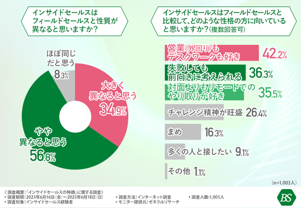 インサイドセールスに向いている人の特長としては、フィールドセールスからはあまりイメージできない、「デスクワークも好き」(42.2%)という意見がみられました。その他「失敗しても前向きに考えられる」(36.3%)、「対面よりもリモートのやり取りが好き」(35.5%)といった特徴が挙げられました。