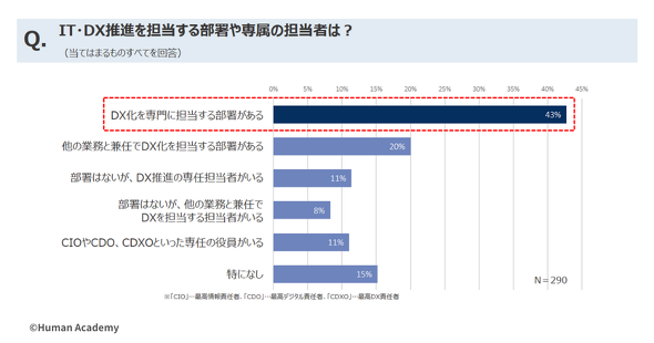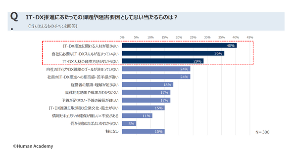 日本企業のDXが進まない理由、課題はどこにあるのか。教育事業を手掛けるヒューマンアカデミー(東京都新宿区)が人事・研修担当者300人を対象に調査した。