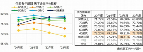 コロナ禍だった2020年度から黒字企業率の推移をたどると、60歳代以下では回復傾向にあり、2023年度の黒字企業率はコロナ禍に突入した2020年度を上回った。一方、70歳代、80歳以上は、2021年度にいったん回復したが、以降は悪化し2023年度の黒字企業率は2020年度を下回った。