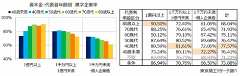 資本金別でみると、「資本金1億円以上」では、80歳以上の黒字企業率が90.5%で1位となり、年齢が高いほど黒字企業率も高い傾向がみられた。一方、「資本金1千万円以上1億円未満」は40歳代の81.6%、「1千万円未満・個人企業他」では40歳未満の72.2%がそれぞれ1位となった。中小・零細企業では代表者の年齢が若いほど黒字企業率が高く、大企業とは対照的だった。
