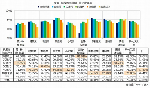 10産業のうち6産業で、代表者が比較的若い「50歳未満」で黒字企業率が最多となった。一方、「80歳以上」の黒字企業率が最多だったのは「金融・保険業」の81.8%のみで、 「70歳代」はなかった。代表者の年齢が高いほど黒字企業率が低下する産業が多い中、「金融・保険業」「情報通信業」は代表者が若い企業で黒字企業率が低く、「70歳代」「80歳以上」の黒字企業率が高かった。