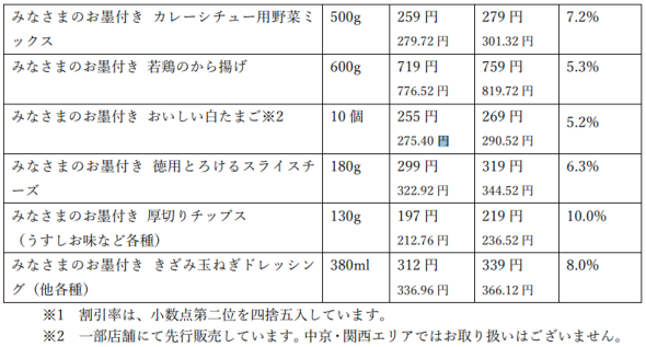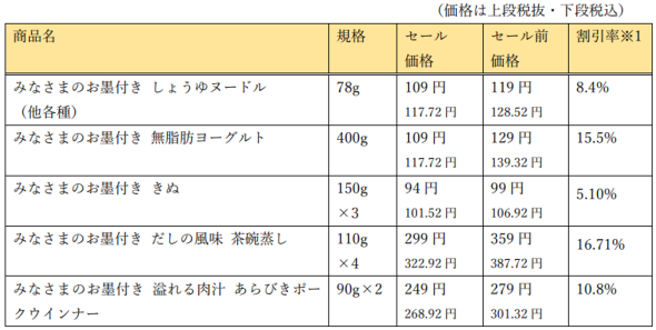 値下げの対象となるのは、たまご、ヨーグルト、豆腐、ウインナー、冷凍食品などの46品目。「しょうゆヌードル」を128円から117円に(8.4%)、「無脂肪ヨーグルト」を139円から117円に(15.5%)、「だしの風味 茶碗蒸し」を359円から299円に(16.7%)、それぞれ値下げする。同社は「購買頻度が高い商品を厳選し、生活応援の一助になればと考え実施するもの」とコメントしている。
