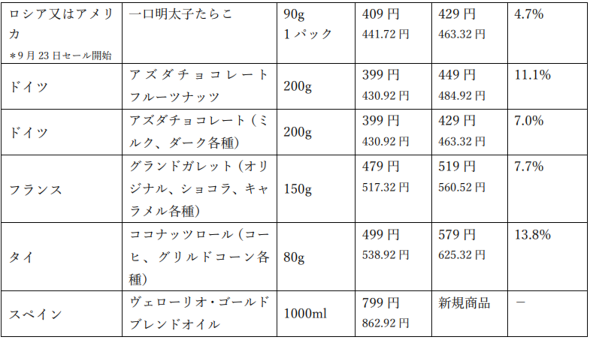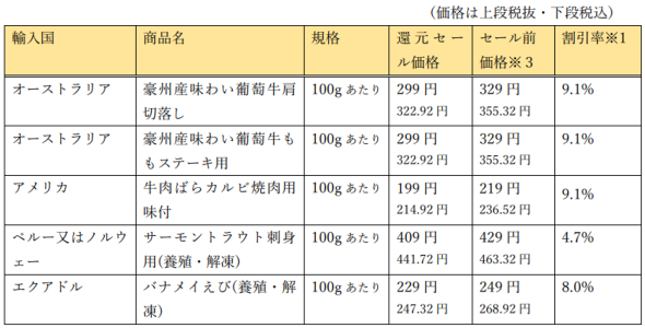 セールの実施期間は輸入生鮮食品が9月19〜25日、輸入加工食品が9月19日〜10月2日。輸入生鮮食品は全国の254店舗で、輸入加工食品は北海道を除く245店舗で実施する。