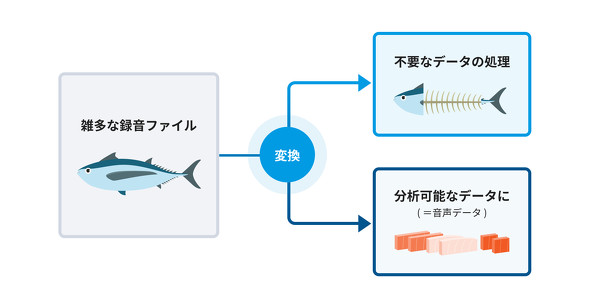 単純に録音ファイルをためるだけでは、AI活用にはつながりません。録音ファイルのような未処理のデータ(非構造化データ)をAIが使える適切な音声データ(構造化データ)に整える必要があります。録音ファイルを魚に置き換えると分かりやすいでしょう。
