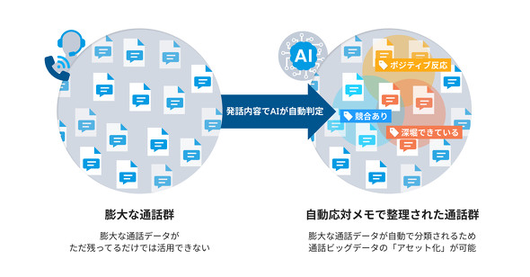 第1段階として、音声認識エンジンによりテキストデータに変換します。さらに、話し方・感情解析エンジンの解析結果や周辺システムの情報とひも付けることで、「誰が、いつ、どの業界の、どの担当者と、何をどのように話して、その結果どうだったのか」といった会話内容が構造化データとして整理された状態で保存され、検索・分析可能なデータにトランスフォーメーションさせることができます。