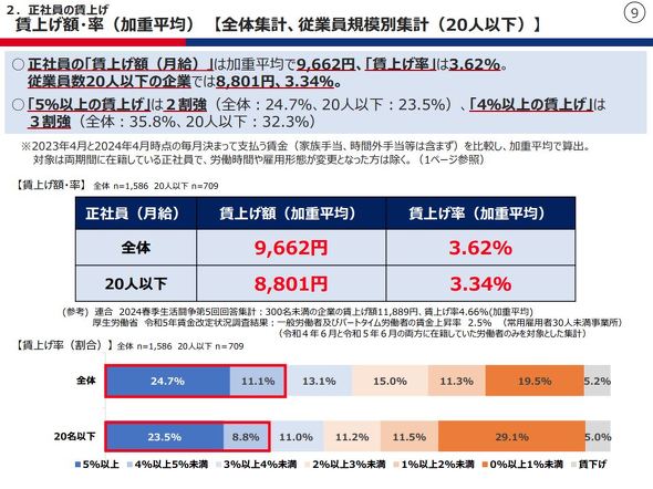 中小企業で働く労働者は日本の労働者の7割を占めている。連合の集計では300人未満の中小の組合の賃上げ率は4.45%となっている。内訳は100〜299人の企業が4.62%、99人以下の企業は3.98%と規模間格差が存在する。
