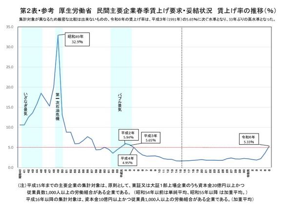 連合の最終集計によると、今年の春闘の賃上げ率は定期昇給込みで5.10%(7月1日)、経団連の発表でも定昇込み賃上げ率は5.58%(8月5日、最終集計、従業員500人以上)と、いずれも1991年以来、33年ぶりの高い水準となった。