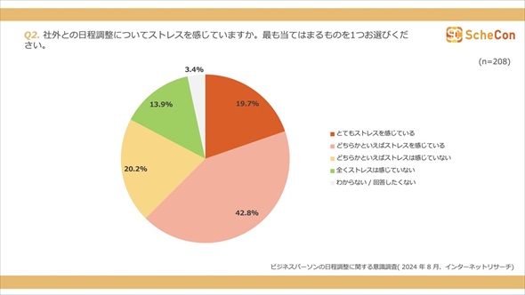 社外との日程調整についてストレスを感じているかを聞いた。「ストレスを感じている」と答えた人は62.5%(「とてもストレスを感じている」19.7%、「どちらかといえばストレスを感じている」42.8%の計)で、「ストレスは感じていない」(「どちらかといえばストレスは感じていない」20.2%、「全くストレスは感じていない」13.9%)と答えた人よりも多い結果となった。