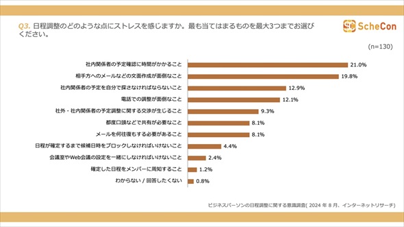 日程調整でストレスを感じる点を3つまで挙げてもらったところ、最も多かった回答は「社内関係者の予定確認に時間がかかること」(21.0%)で、2位以下には「相手方へのメールなどの文面作成が面倒なこと」(19.8%)、「社内関係者の予定を自分で探さなければならないこと」(12.9%)が続いた。