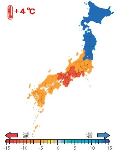 気温が4度上昇した場合に、米の収穫量が1981年から2000年の平均に比べてどう変わるかをプラスマイナスのパーセントで示している。関東地方から西の地域では、平均で5〜15%も減ると予測されている。一方、北日本では暖かくなることで逆に増加の傾向が見られる。