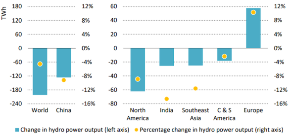 中国では、南部で大洪水、中部で干ばつという、温暖化ならではの極端な気候に襲われ、水力発電が歴史的な大不振となった。最大の問題は、水力発電のカバーを石炭火力発電に頼ったことで、2023年の中国、そして世界のCO2排出量の増加を招くこととなった。