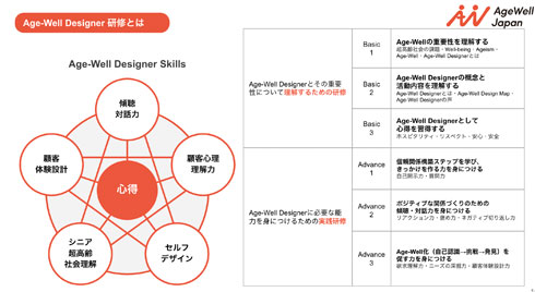 シニアの自己肯定感を高めるには、ホスピタリティが最も大切という考えから、相手に喜んでもらうための褒め方やネガティブな言葉への対応方法などの実践的なスキルに加え、傾聴、対話力、顧客体験設計、シニア理解、エイジズムやウェルビーイングに関する知識の習得にも焦点を当てている。