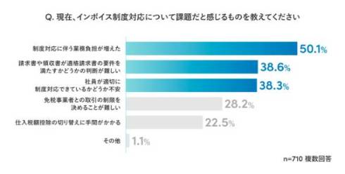具体的な課題については、「制度対応に伴う業務負担が増えた」が最も多く50.1%。以降は「請求書や領収書が適格請求書の要件を満たすかどうかの判断が難しい」(38.6%)、「社員が適切に制度対応できているかどうか不安」(38.3%)と続いた。