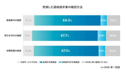 受領した適格請求書の「登録番号の確認」「取引年月日の確認」「消費税額の検算」などの要件を確認する際、約7割が目視確認を行っていると明らかになった。また、現場部門が目視確認しているケースも全ての項目で1割ほど見られ、デジタル化できていない確認業務により手間がかかっていることが分かる。