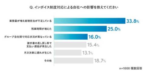 インボイス制度による自社への影響については、「業務量が増え経理担当者が不足している」が最も多く33.8%。以降は「残業時間が増えた」(25.0%)、「グループ会社間で対応状況が異なっている」(16.0%)と続いた。業務量増加による影響にとどまらず、グループ会社間によって対応が一致していないなど、コーポレートガバナンス上でも懸念がある現状が明らかになった。
