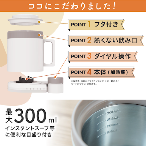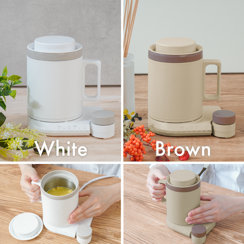 容量は300ミリリットルで、寸法は130(幅)、135(高さ)、97(直径)ミリと卓上に置けるサイズで、家庭用コンセントから給電も可能とした。専用マグカップに水を入れ、本体(土台)にセット、本体のダイヤルでモードをセットすれば水が沸く。カラーはホワイトとブラウンの2色、価格は7480円。