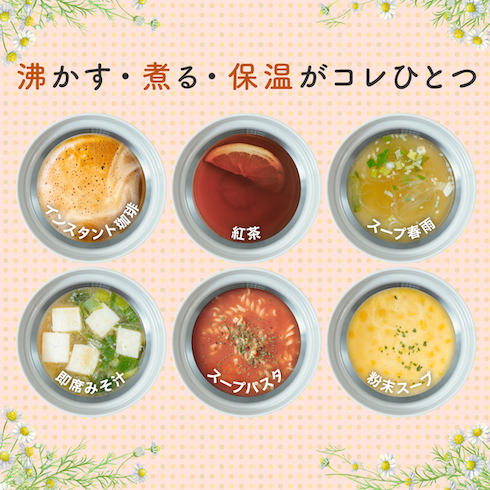 飲み物だけでなく、スープやミニラーメンなどを入れて調理し、そのまま器としても使うこともできるほか、マグカップは丸ごと洗うことが可能。沸騰後でも飲み口が熱くなりにくい飲み口カバーを採用した。