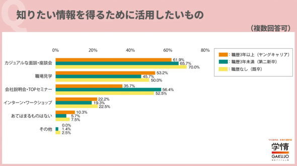 企業についての情報を得るために活用したいものは、「カジュアルな面談・座談会」が最多に。社会人経験3年以上の「ヤングキャリア」で61.9%、3年未満の「第二新卒」で65.7%、職歴のない「既卒」で70.7%の支持を集めた。