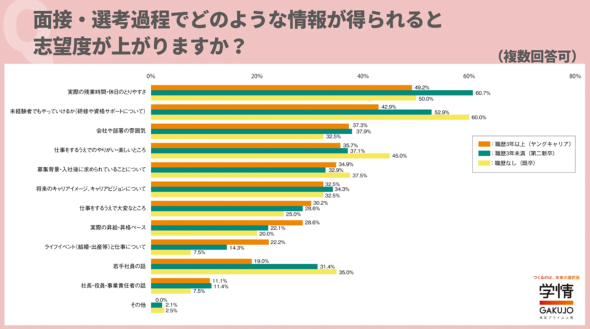 応募後に情報を得られると志望度が上がるものは、ヤングキャリアと第二新卒で共に「実際の残業時間・休日のとりやすさ」が最多となった(ヤングキャリアで49.2%、第二新卒で60.7%)。「未経験でもやっていけるか(研修や資格サポートについて)」、「会社や部署の雰囲気」が続いた。
