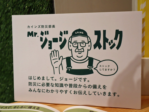 最近、カインズの店頭に「Mr.ジョージ・ストック」というキャラクターが登場している。カインズの防災部長という肩書で、年齢は48歳。好きな言葉は「備えあれば憂いなし」、口癖は「ストックしてますか?」となっている。「防災用品を、ジョージ(常時)ストックしてほしい」という願いが名前に込められているという。