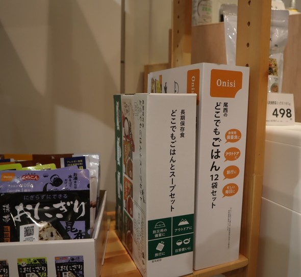 カインズがアピールする商品の一つが「どこでもごはん12袋セット」だ。A4サイズの箱に長期保存食が入っており、本棚にも並べられるようにしている。担当者は「災害用の保存食は見えない場所に収納されることも多く、いざというときに『どこにしまったかな?』となりがちです。すぐ取り出せる場所に置いてほしいと思い、開発しました」と説明する。この商品の売れ行きが好調だったため、今年は同じコンセプトの「どこでもごはんとスープセット」を発売した。