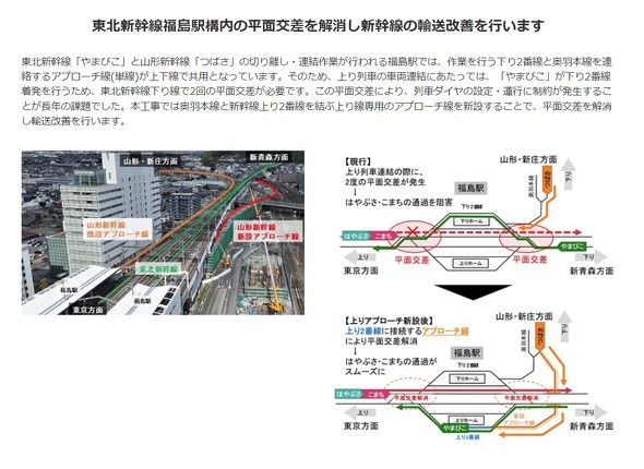 東北新幹線の福島駅は山形新幹線につながる線路が下り線側しかないため、上り列車が下り線側に移る必要がある。その結果、下り線をふさいでしまうためダイヤが乱れると回復しにくい構造だった。現在、上り線側にも山形新幹線と接続する線路を建設している(出典:JR東日本、山形新幹線福島駅上りアプローチ線新設)「はやぶさ」と「こまち」、「やまびこ」と「つばさ」の連結運転では、「こまち」と「つばさ」の遅延が発生しやすい。原因は天候だ。「こまち」の田沢湖線、「つばさ」の奥羽本線はともに奥羽山脈を越える地点で豪雨、豪雪が起きやすい。この問題を解決するために、田沢湖線、奥羽本線ともに長距離トンネルを新設する計画がある。