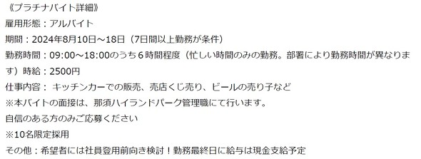 冒頭に書いた通り、同パークは8月10〜18日の期間で時給2500円のプラチナバイトを募集した。勤務時間は午前9時〜午後6時のうち、6時間程度。7日間以上の勤務が条件だ。キッチンカーでの販売やビールの売り子などで募集をかけ、採用者は呼び込みや接客、調理や販売などの業務を担当したという。