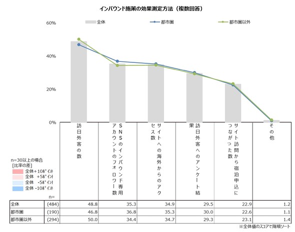 インバウンド施策の効果を「測定している」自治体は56.0%だった。測定している項目は「訪日外国人客の数」が最も多く48.4%だった。その他「SNSのインバウンド専用アカウントのフォロワー数」「サイトへの海外からのアクセス数」が上位に挙がった。