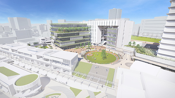 本プロジェクトの1期工区では、同社が「星が丘テラス」の増床を含めた複合ビルを新設。開発パートナーである椙山女学園が大学を新設し、街に開かれた歩行者動線や広場の一部を整備する。