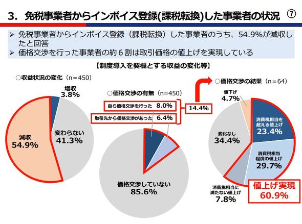 インボイス制度導入による収益の変化について調査したところ、インボイス登録した事業者のうち、54.9%が減収したと回答。しかし、価格交渉を行った事業者の約6割は取引価格の値上げを実現できている。