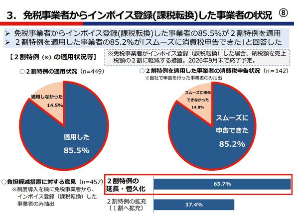 2割特例(インボイス登録した場合、納税額を売上税額の2割に軽減する措置。2026年9月末で終了予定)の適用状況も調査した。インボイス登録した事業者の85.5%が適用しており、消費税申告についても85.2%がスムーズに申告できたという。