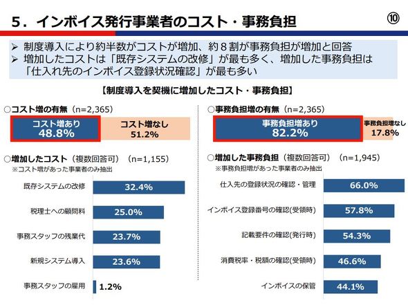 インボイス導入に伴い、48.8%が「コスト増あり」と回答した。増加したコストとしては、32.4%が「既存システムの改修」、25.0%が「税理士への顧問料」、23.7%が「事務スタッフの残業代」を挙げた。