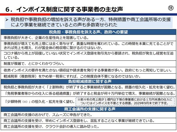 負担軽減措置に対しても、「免税事業者等からの仕入に係る経過措置」が終了すると税金が何十万円単位で増え、事業継続が困難となる」「税負担と事務負担が大きく、2割特例が終了すると事業継続が困難となる。措置の恒久化・拡充を強く望む」といった声があった。