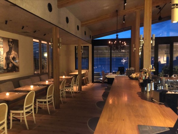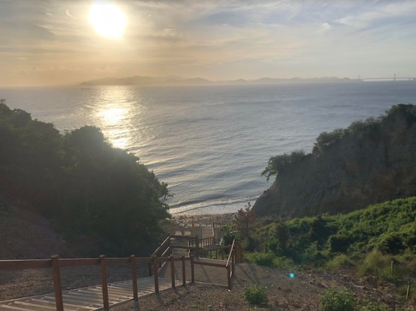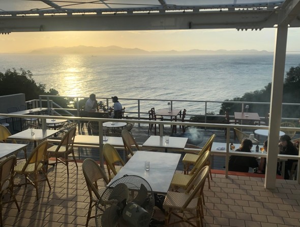 店内に入ると、いきなり海への雄大な展望が開ける。潮風をより感じたい人向けにはテラス席も設けており、席数は130席。真昼に訪れるのも良いが、夕陽が沈む眺めも絶景であり、夜は崖をライトアップし、幻想的な雰囲気が醸し出される。店から海岸まで階段があり、海辺にも降りられる。