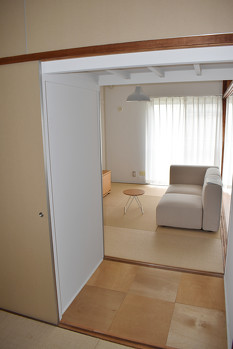 モデルルームの壁は、従来のものから白に塗装し直した。柱・鴨居も以前のものをそのまま活用している。ふすまはダンボール製のものや樹脂製の半透明のものに置き換えた。明かりが見える半透明のふすまは圧迫感を抑える効果があるという。