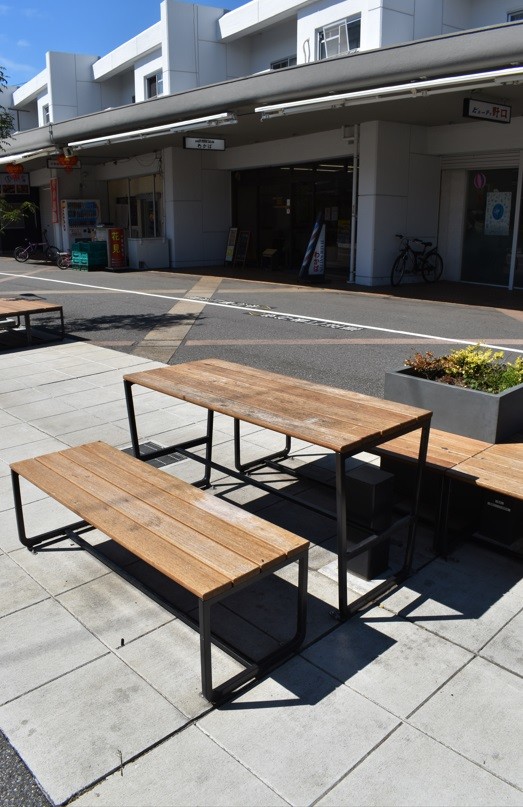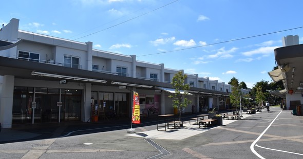 同プロジェクトでは、花見川団地商店街のリノベーションも行っている。以前の建物を残しつつ再塗装し、住棟番号の表示も新たなものに取り替えた。共用部には高木とストリートファニチャーを設置している。団地の商店街は古さが否めないのが通常だが、花見川団地商店街はどこか若者の街のような雰囲気を受けた。
