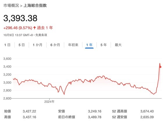 この急騰は主に9月24日に発表された金融政策によるものと見られている。中国人民銀行が預金準備率の引き下げや住宅ローン利率の削減など3つの金融緩和政策を打ち出したことで、市場に流動性が戻り、投資家の買い戻しが発生したことが大幅な株価上昇の要因だ。