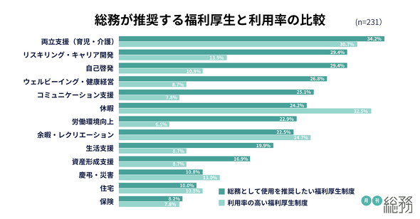 総務専門の雑誌『月間総務』の調査から、総務が利用を促したい福利厚生と、現場の利用実態に差があることが分かった。