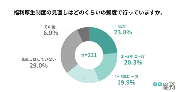 福利厚生の見直し頻度については、23.8%が「毎年」としており、最多の回答となった。2位は「2〜3年に1度」(20.3%)、3位は「4〜5年に1度」(19.9%)だった。一方、3割は「見直しはしていない」(29.0%)ことも明らかになった。