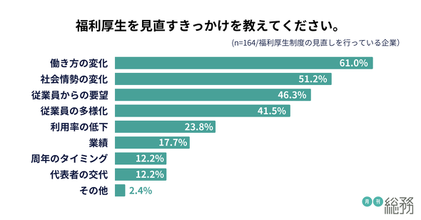 制度の見直しをするきっかけは、61.0%が「働き方の変化」を挙げた。以降「社会情勢の変化」(51.2%)、「従業員からの要望」(46.3%)と続いた。近年のリモートワークの普及などが見直しに影響していると考えられる。