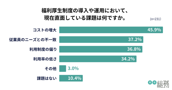 制度導入や運用において現在直面している課題についても調査した。最も多く挙げられたのは「コストの増大」で45.9%だった。2位は「利用制度の偏り」(36.8%)、3位は「利用率の低さ」(34.2%)となった。福利厚生の効果的な運用には、コスト面や利用状況に課題があることが明らかになった。