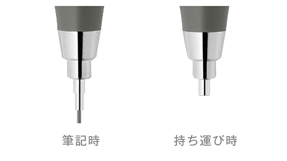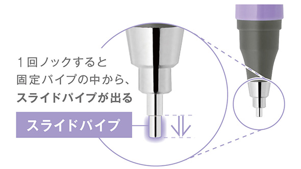 リントシステムにより、1回ノックすると先端のパイプがスライドして出てきて、長さが2倍以上になる。これにより同社史上最もパイプが長いシャープペンとなり、従来品と比較して書いている文字の視認範囲が1.5倍に広がった。