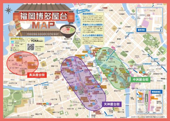 福岡市の屋台街は、店舗数が多い「天神エリア」(約50軒)と「中洲エリア」(約30軒)、小規模な「長浜エリア」(9軒)と「その他エリア」(7軒)があり、合計で約100軒が営業している(2024年9月時点)。最初の屋台DXは、繁華街から少し離れた長浜屋台街からスタートした。