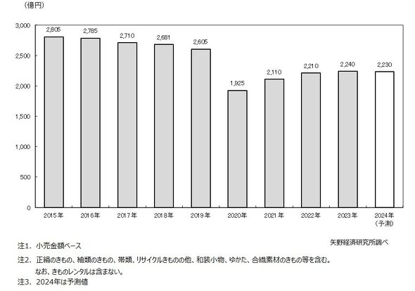かつて「2兆円産業」と呼ばれていた着物業界。その最盛期は1974〜75年とされ、業界の市場規模は1兆8000億円から2兆円に及んでいた。その後は衰退の一途をたどり、矢野経済研究所によれば2023年の市場規模は2240億円と、10分の1近くに縮小している。