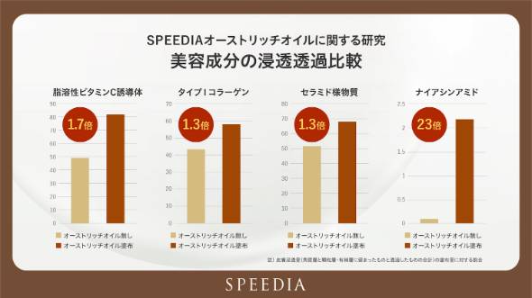 スピーディアが実施したダチョウのオイルに関する研究では、肌水分量を増加させ、美容成分を肌に浸透させ続ける能力が高いことが証明されている。特に、近年人気の成分であるナイアシンアミドに関しては、オイルの塗布により浸透効果が23倍になることが分かった。